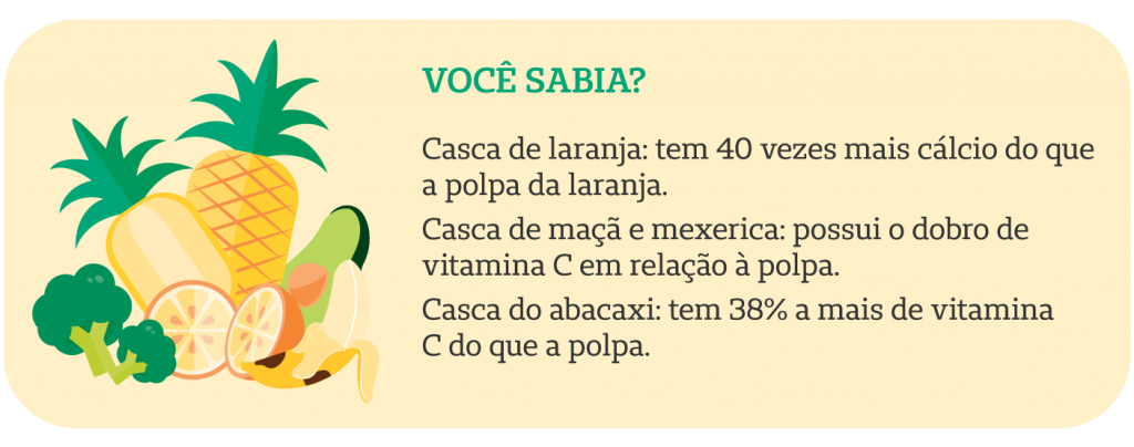 Cascas: cascas de laranja, tangerina e maracujá costumam ser usadas para preparar geleias. As de maçã e mamão podem ser acrescentadas às vitaminas de frutas. Também é possível preparar chás com a casca de abacaxi, maçã, melancia e laranja.
